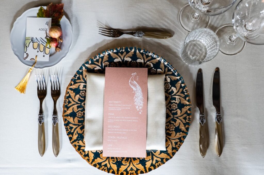 Grandma’s plates are trendy, but whatever set you choose, the important thing is to keep a certain chromatic harmony. “Le posate vanno collocate all’estero del piatto, a sinistra le forchette e a destra i coltelli con la lama rivolta verso il piatto. I bicchieri, scelti in funzione del menu e del vino che sarà servito (vino bianco o rosso), vanno posizionati sul lato destro in corrispondenza alla punta dei coltelli”